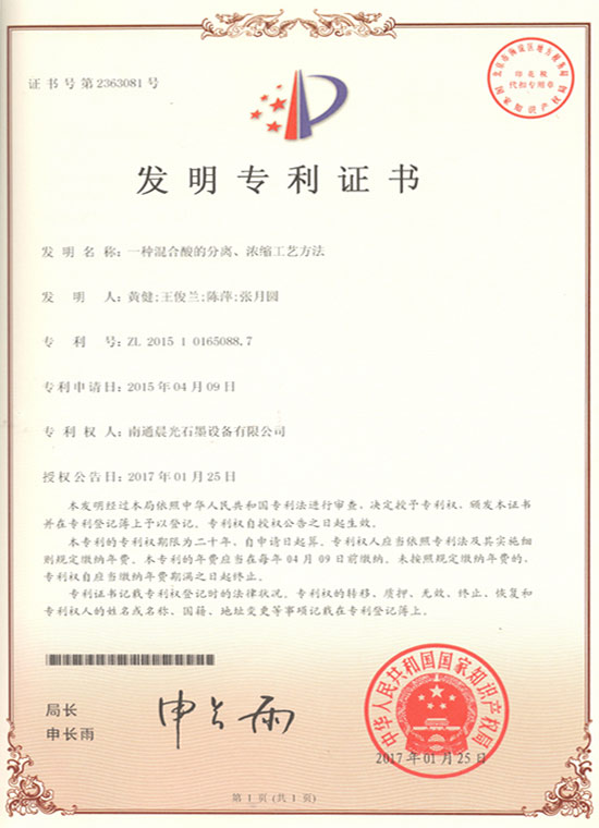 发明专利:一种混合酸的分离、浓缩工艺方法 专利号:ZL 2015 1 0165088.7