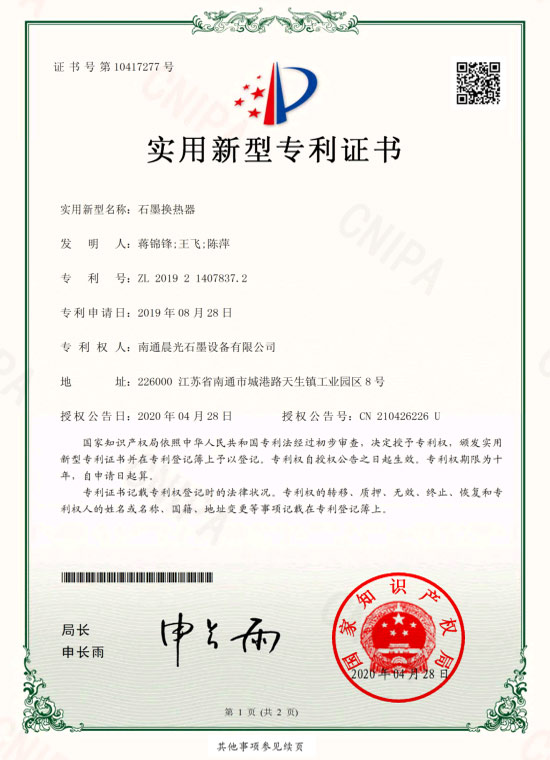 实用新型专利 :石墨换热器 专利号:ZL 2019 2 1407837.2