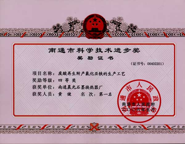 2006年5月,废酸再生附产氯化亚铁的生产工艺,荣获南通市科学技术进步奖,四等奖