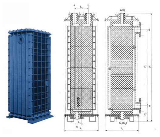 矩形块孔式石墨热交换器由截面为矩形的单元换热块叠装而成,整体强度高,耐热冲击性能好,传热效率高使用寿命长。本公司常规生产均为内联式单向耐腐蚀3JK型与KS型两系列。