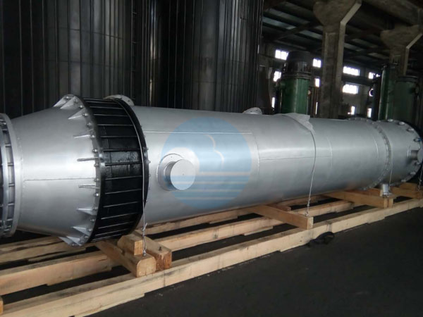 石墨喷淋塔直径可达到2800mm,设置多层石墨筛板,筒体内壁为石墨材质,外壁采用钢制抱圈加强,筒体之间是通过钢抱圈上焊接半环,将拉杆穿过半环进行密封,降低了设备的重量及制造成本,便于发运安装;筒壁设置多层侧喷,形成360度喷淋,保证喷淋效果,可拆卸喷淋头设置为石墨材质,防止了烟气腐蚀,设置亚力克材质试镜,设置石墨液位计套管便于安装及查看;通过在上盖板与上封头之间通过螺杆固定,从而将石墨封头通过拉杆的作用力与上盖板固定,增大石墨封头的强度,即上盖板对于石墨封头的补强的强度,降低了石墨封头的厚度,相对保证了浸渍厚度。